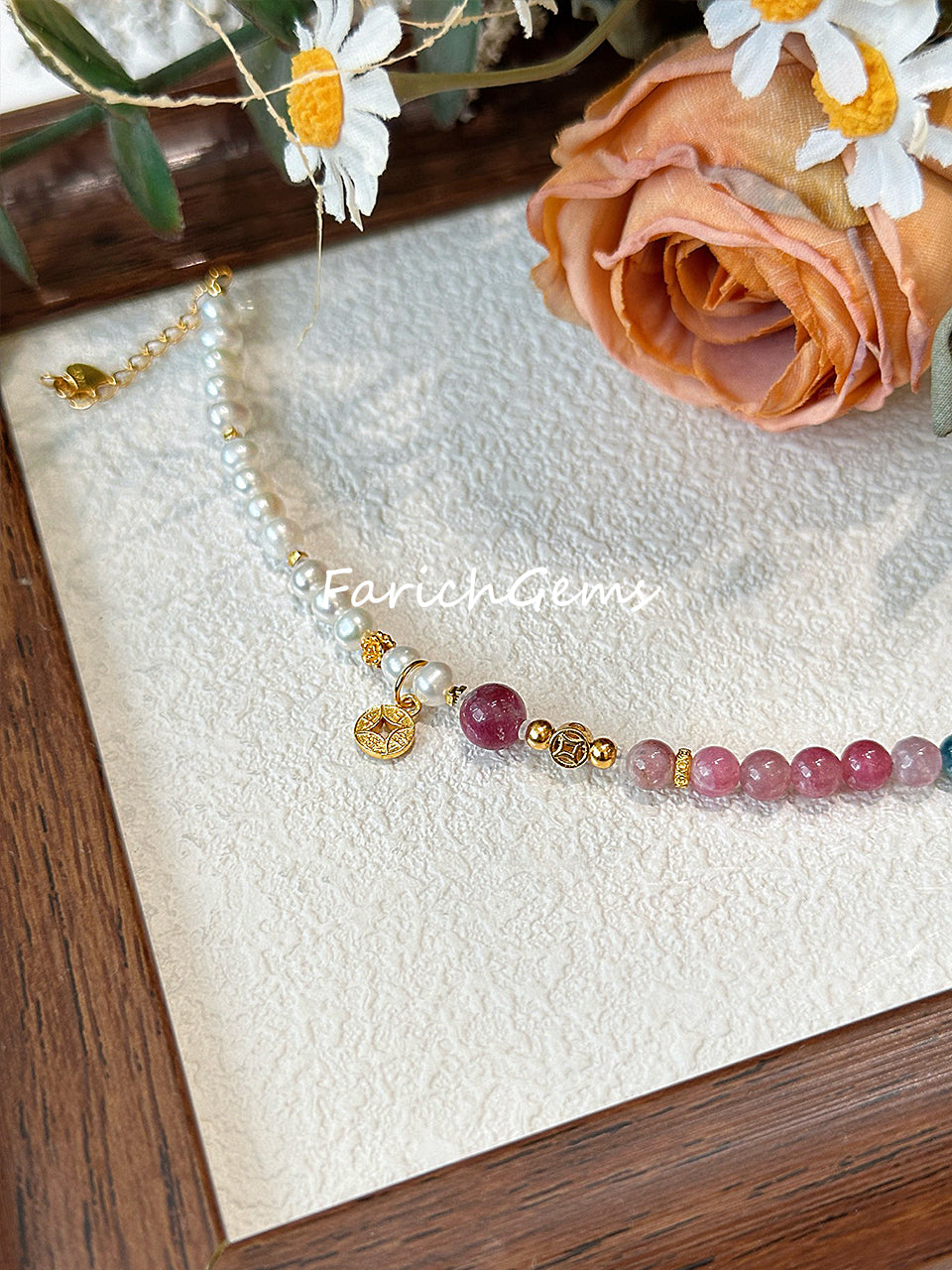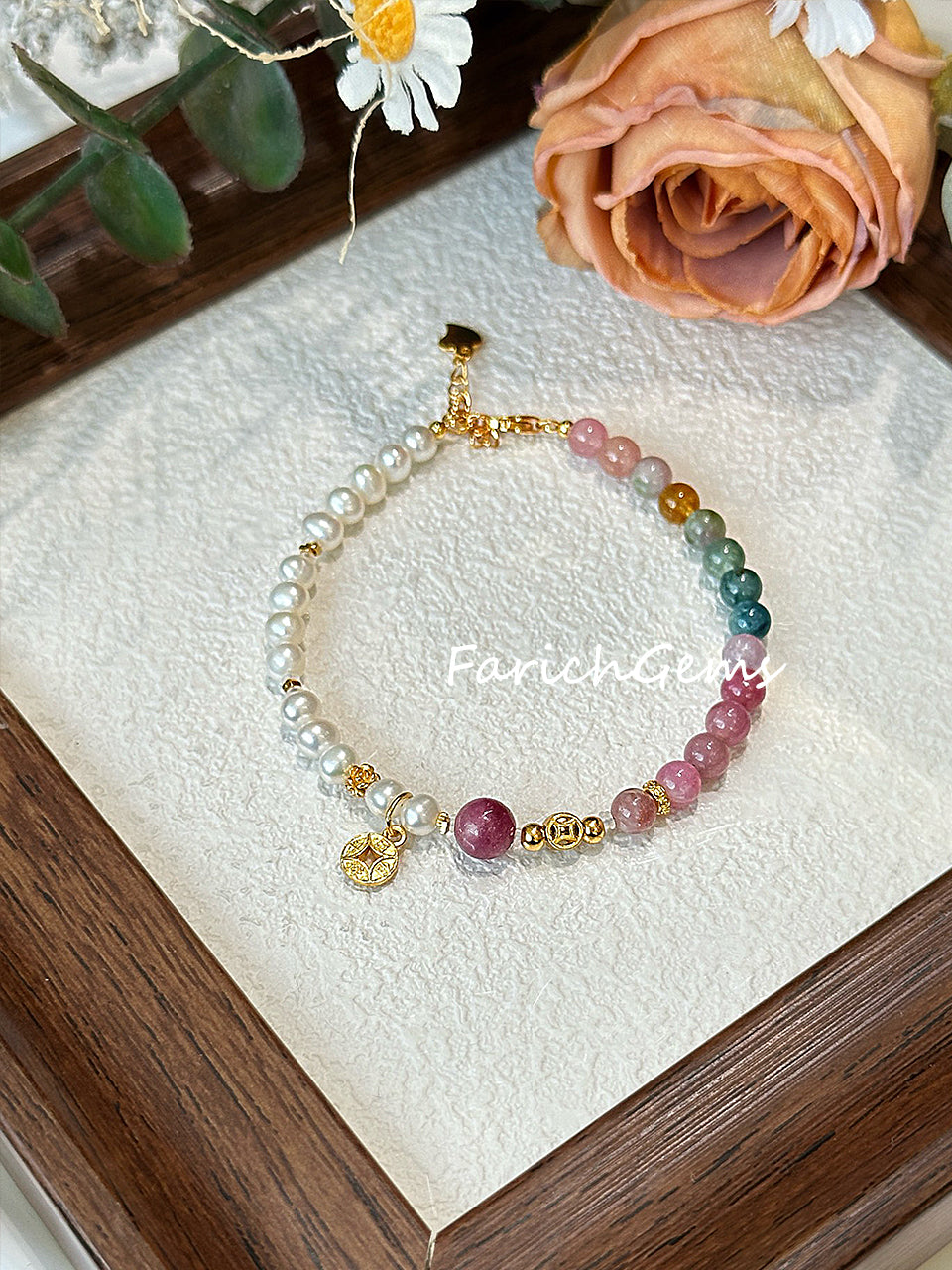 Rainbow Tourmaline Pearl Beaded Crystal Bracelet 4/6.5+4mm