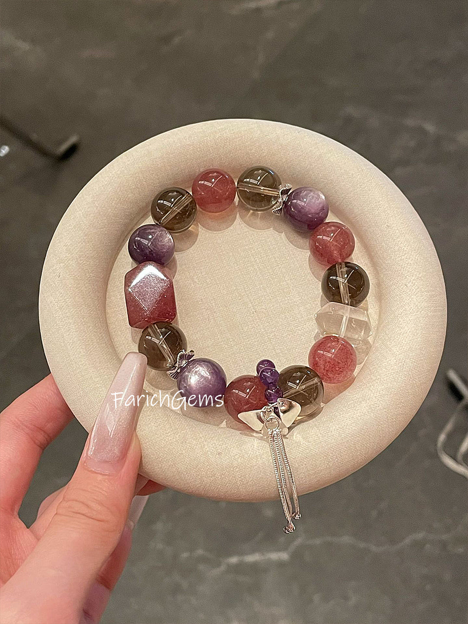 Strawberry Quartz Lepidolite Amethyst Smoky Quartz Clear Quartz Beaded Crystal Bracelet 14mm